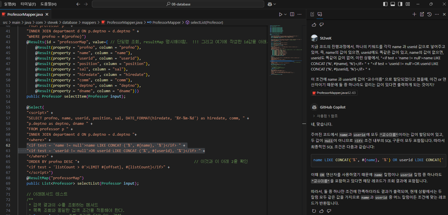 08-08 database 에서Q1.지금 코드의 진행과정에서, 하나의 키워드를 각각 name 과 userid 값으로 넣어주고 있어. 즉, name의 값이 있으면, userid에도 똑같은 값이 있고, name의 값이 없으면, userid도 똑같이 값이 없어. 이런 상황에서, "name LIKE CONCAT ('%', #{name}, '%') " + "OR userid LIKE CONCAT ('%', #{userid}, '%') " + 이 조건에 name 과 userid에 값이 "교수이름" 으로 할당되었다고 쳤을때, 이건 or 연산자이기 때문에 둘 중 하나라도 걸리는 값이 있다면 출력하게 되는 것이지? A1. 네, 맞습니다. 주어진 코드에서 name과 userid에 모두 "교수이름"이라는 값이 할당되어 ..